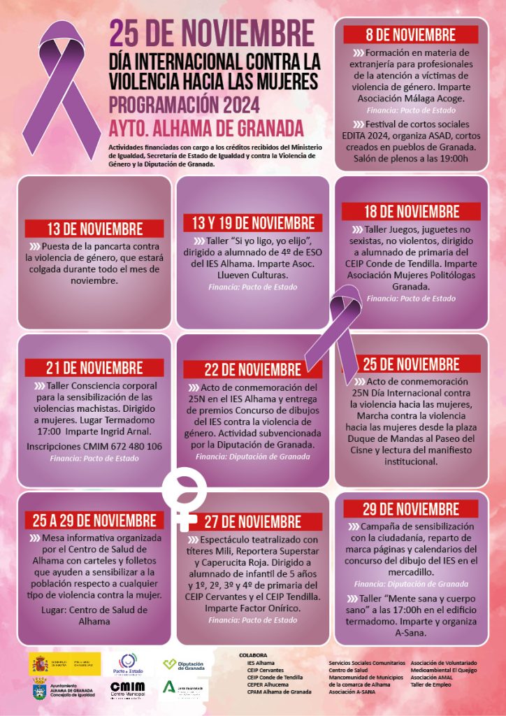 El 22 de noviembre se celebrará un acto en el IES Alhama donde se hará entrega de premios del concurso de dibujos enfocado en la temática de la violencia de género, actividad que contará con la subvención de la Diputación de Granada. Seguidamente, el 25 de noviembre, día clave, se organizará una marcha contra la violencia de género que partirá desde la plaza Duque de Mandas, concluyendo con la lectura de un manifiesto institucional en el Paseo del Cisne.