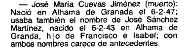José María Cuevas Jiménez nació el 6 de febrero de 1947 en Alhama de Granada. Según informes policiales de la época, también utilizaba el nombre de José Sánchez Martínez, nacido el 6 de febrero de 1943 en la misma localidad, hijo de Francisco e Isabel. A pesar de esta duplicidad de identidades, las autoridades señalaron que carecía de antecedentes penales previos al atraco.