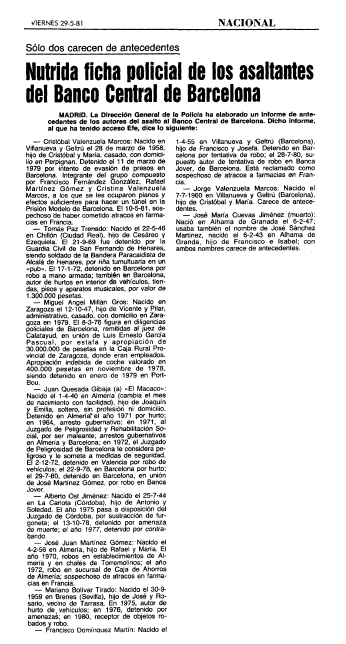 El 23 de mayo de 1981, un grupo de once hombres armados irrumpió en la sede del Banco Central en la Plaza de Cataluña de Barcelona, tomando como rehenes a más de 200 personas. Los asaltantes exigieron la liberación de los militares implicados en el intento de golpe de Estado del 23-F, incluyendo al teniente coronel Antonio Tejero. La situación se prolongó durante 37 horas, convirtiéndose en una de las crisis más tensas de la joven democracia española.