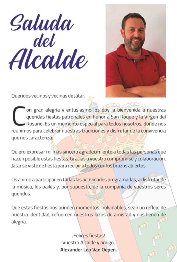 El alcalde de Játar, Alexander Leo Van Oepen, ha expresado su entusiasmo y agradecimiento a todos los que han contribuido a la organización de estas festividades. En su mensaje, destaca la importancia de mantener vivas las tradiciones y la alegría de compartir estos momentos con el pueblo. Invita a todos a participar activamente en las actividades programadas y a disfrutar de la compañía de amigos y familiares.