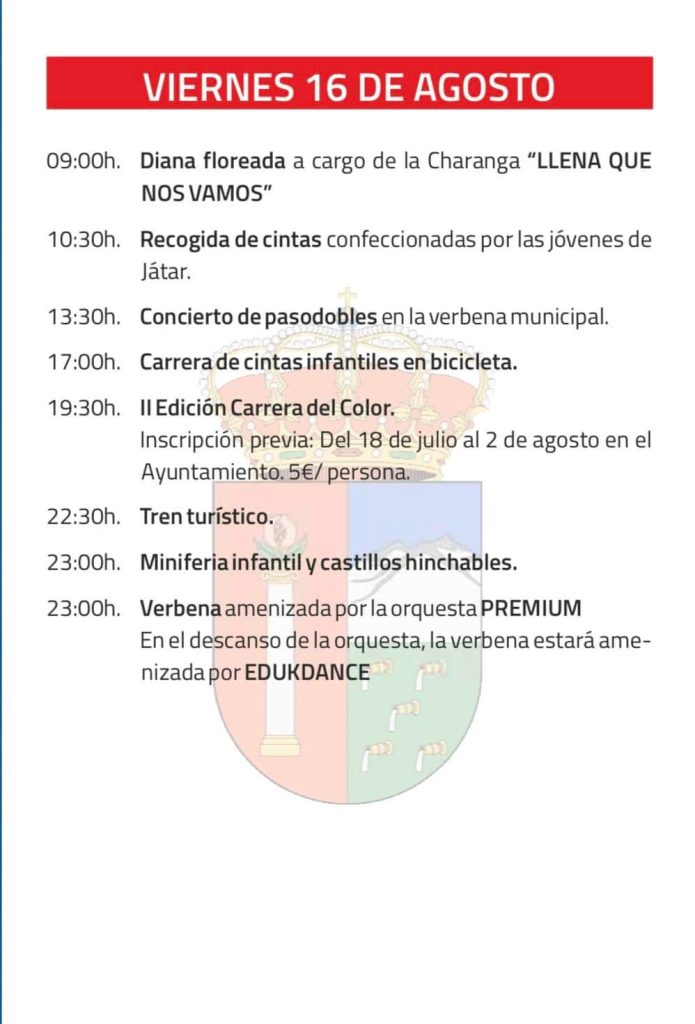 - 19:30h: II Edición Carrera del Color. Inscripción previa del 18 de julio al 2 de agosto en el Ayuntamiento (5€/persona).