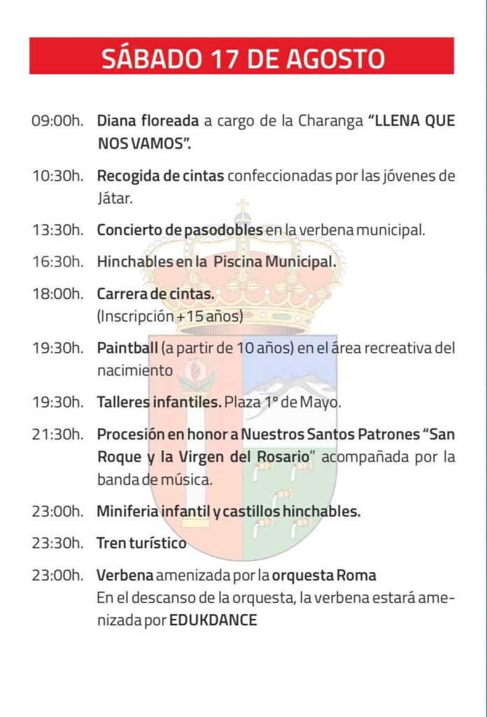 - 12:00h: Santa misa en honor a San Roque y la Virgen del Rosario, Patrones de Játar, acompañada por la banda de música.