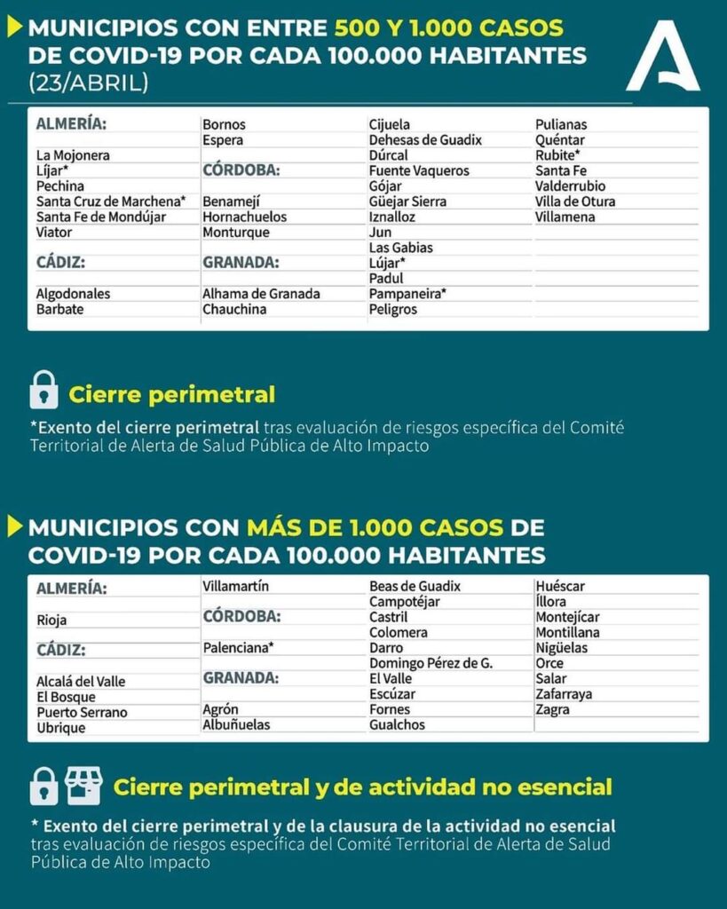 Alhama de Granada, Chauchina, Cijuela, Dehesas de Guadix, Dúrcal, Fuente Vaqueros, Gójar, Güejar Sierra, Iznalloz, Jun, Las Gabias, Padul, Peligros, Pulianas, Quéntar, Santa Fe, Valderrubio, Villa de Otura y Villamena. Pese a tener tasas de incidencia acumulada de más de medio millar de casos, Lújar, Pampaneira y Rubite quedan exentas del cierre perimetral por tener menos de 1.500 habitantes y tras informe epidemiológico, ha detallado la Junta.